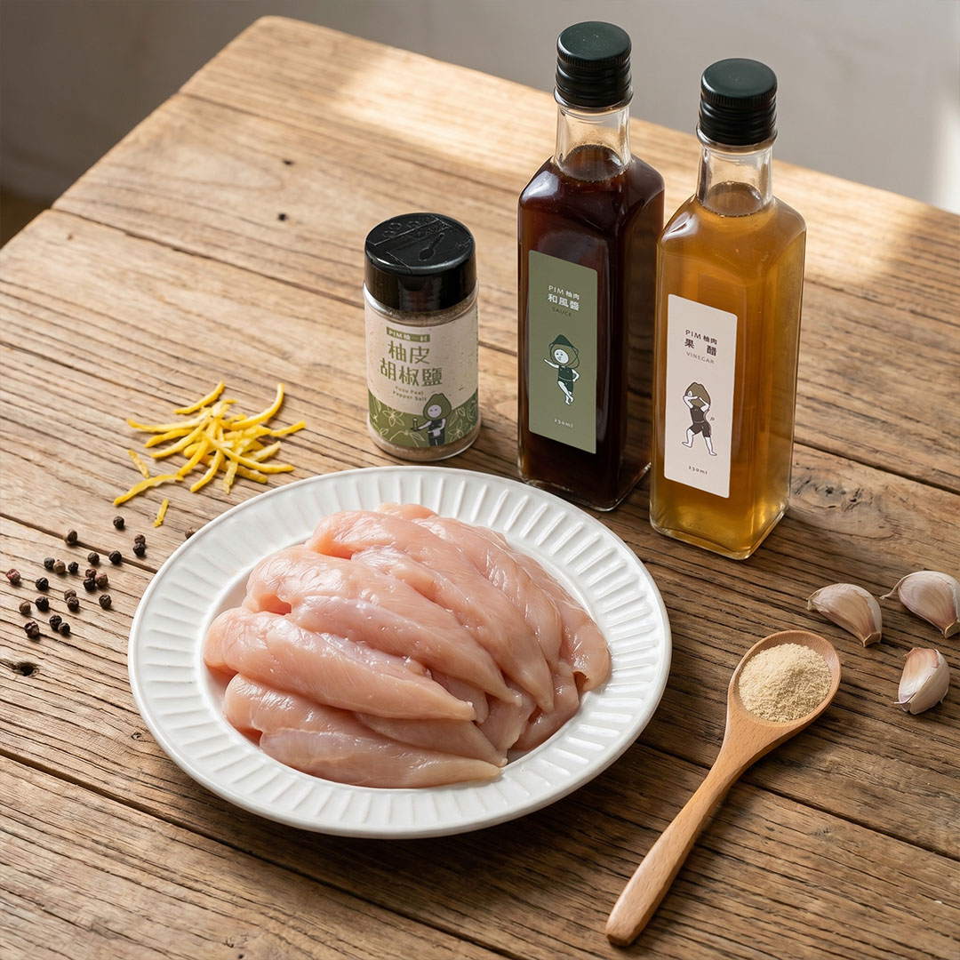 不同於一般的黑胡椒,柚皮胡椒鹽帶有淡淡的柚皮清香與胡椒的微辣感,能帶出雞肉的甜味。