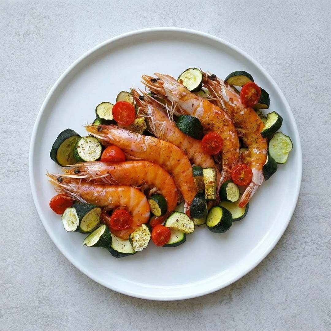 擺盤準備:將白蝦洗淨,去除蝦鬚並挑出腸泥。將處理好的蝦子整齊放在櫛瓜上,接著放上剩餘的櫛瓜與小番茄,再次灑上香料。