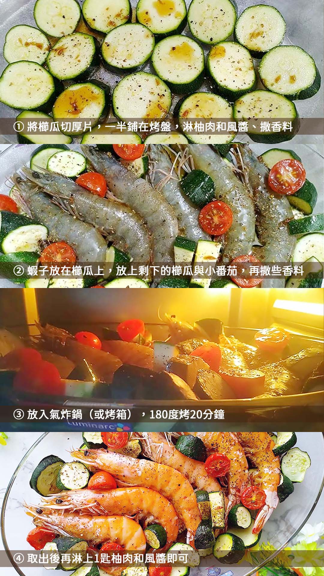 今天要分享的這道「櫛瓜烤蝦」,結合了鮮甜的白蝦與清脆的櫛瓜,並特別選用柚肉和風醬作為調味核心。