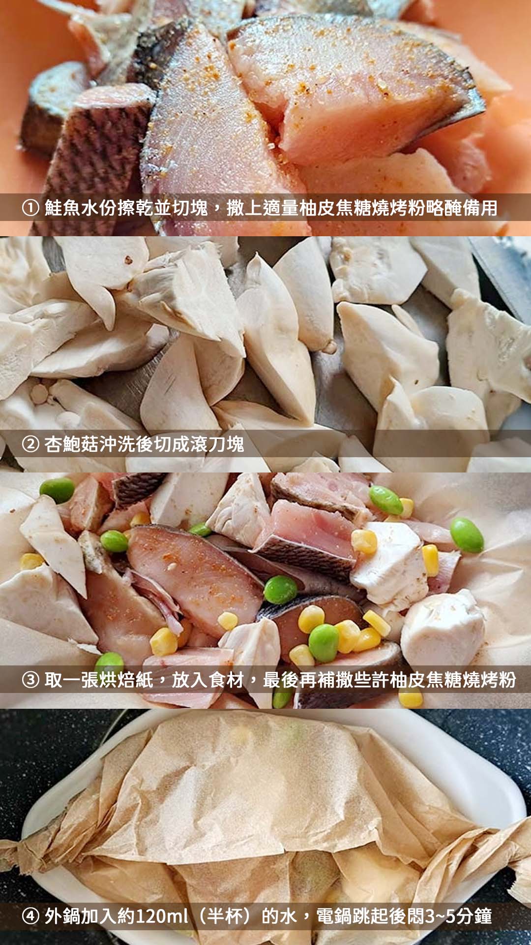 這道柚香紙包鮭魚食譜做法非常簡單,只要有電鍋就能完成。