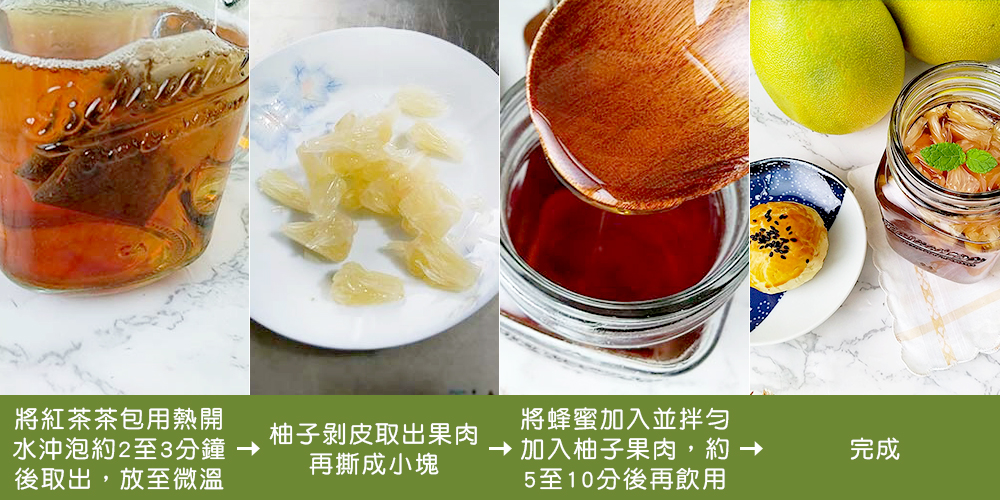 紅玉紅茶茶包 1個、熱開水 350cc、蜂蜜 30g、柚子肉 60g