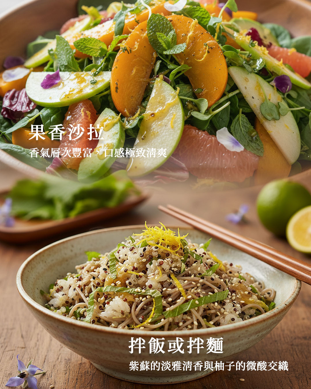 風味拌飯拌麵: 在熱騰騰的白飯、藜麥或五穀麵中,滴入幾滴紫蘇籽油與和風醬。紫蘇的淡雅清香與柚子的微酸交織,讓簡單的家常餐點變身營養美味的輕食。