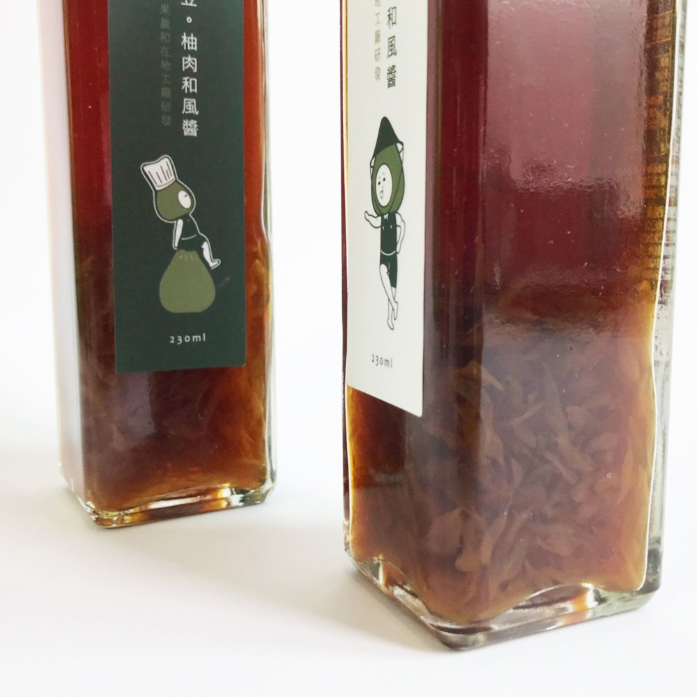 【柚一村】柚肉和風醬: 將麻豆文旦柚肉融入純釀造醬油。無添加油脂配方,帶有高雅的柑橘果香,能帶出食材原始鮮甜,讓餐點清爽無負擔。