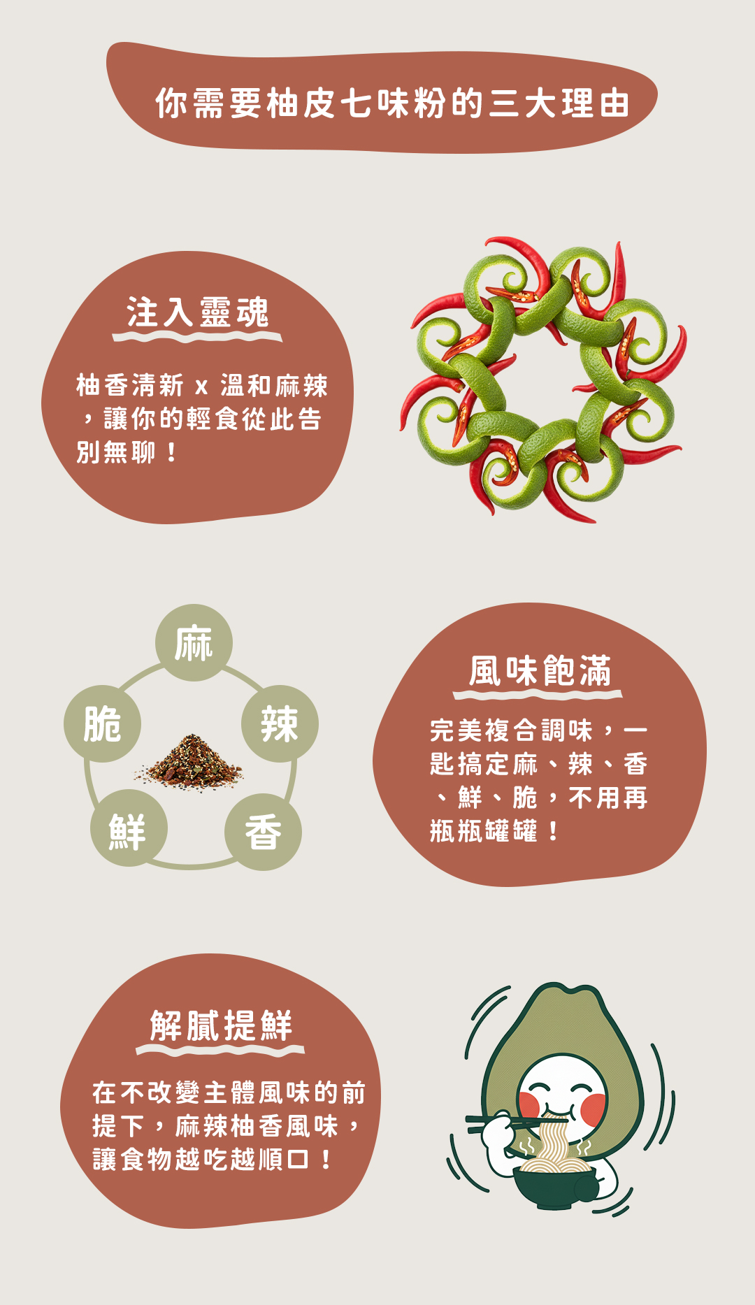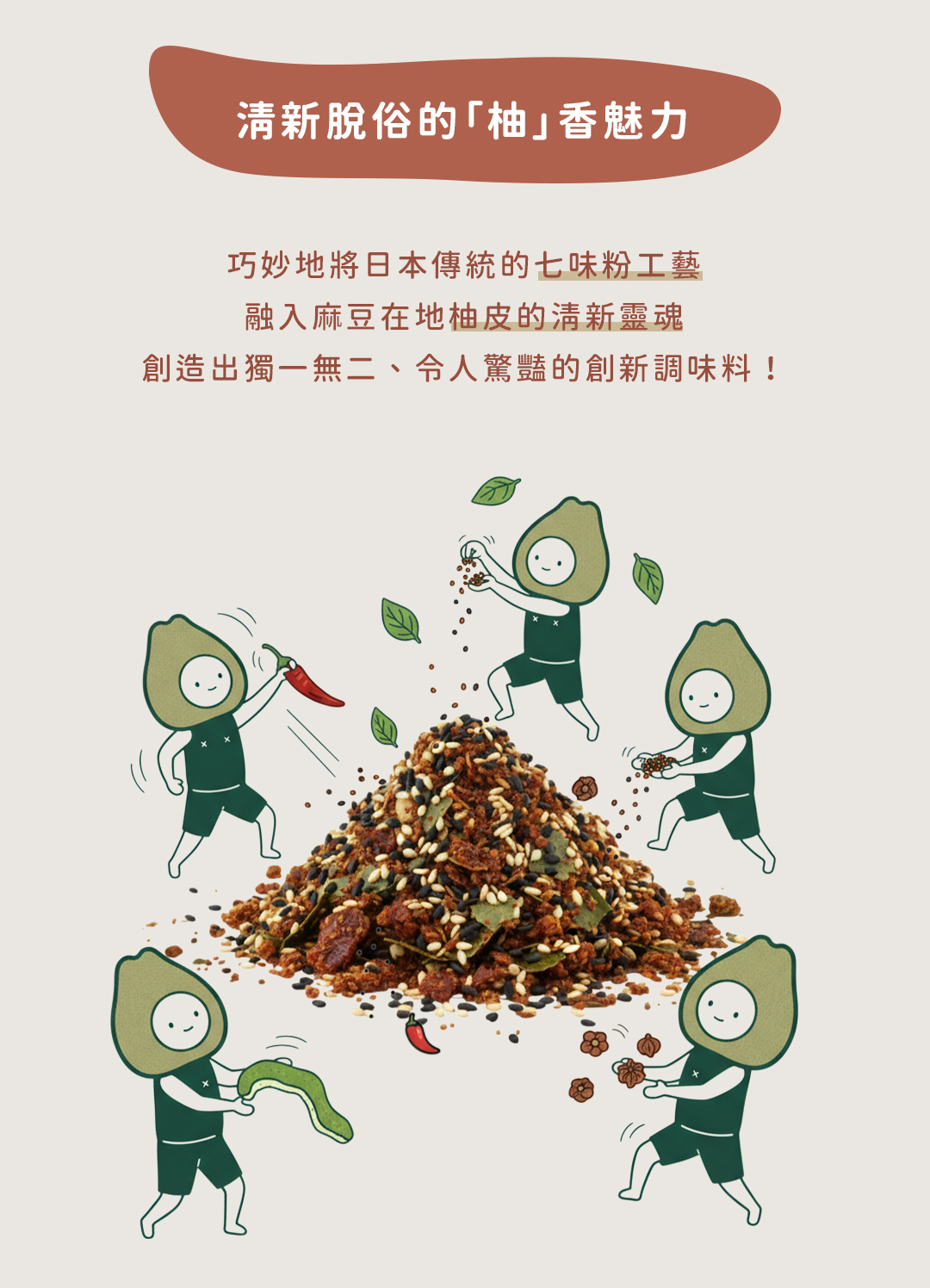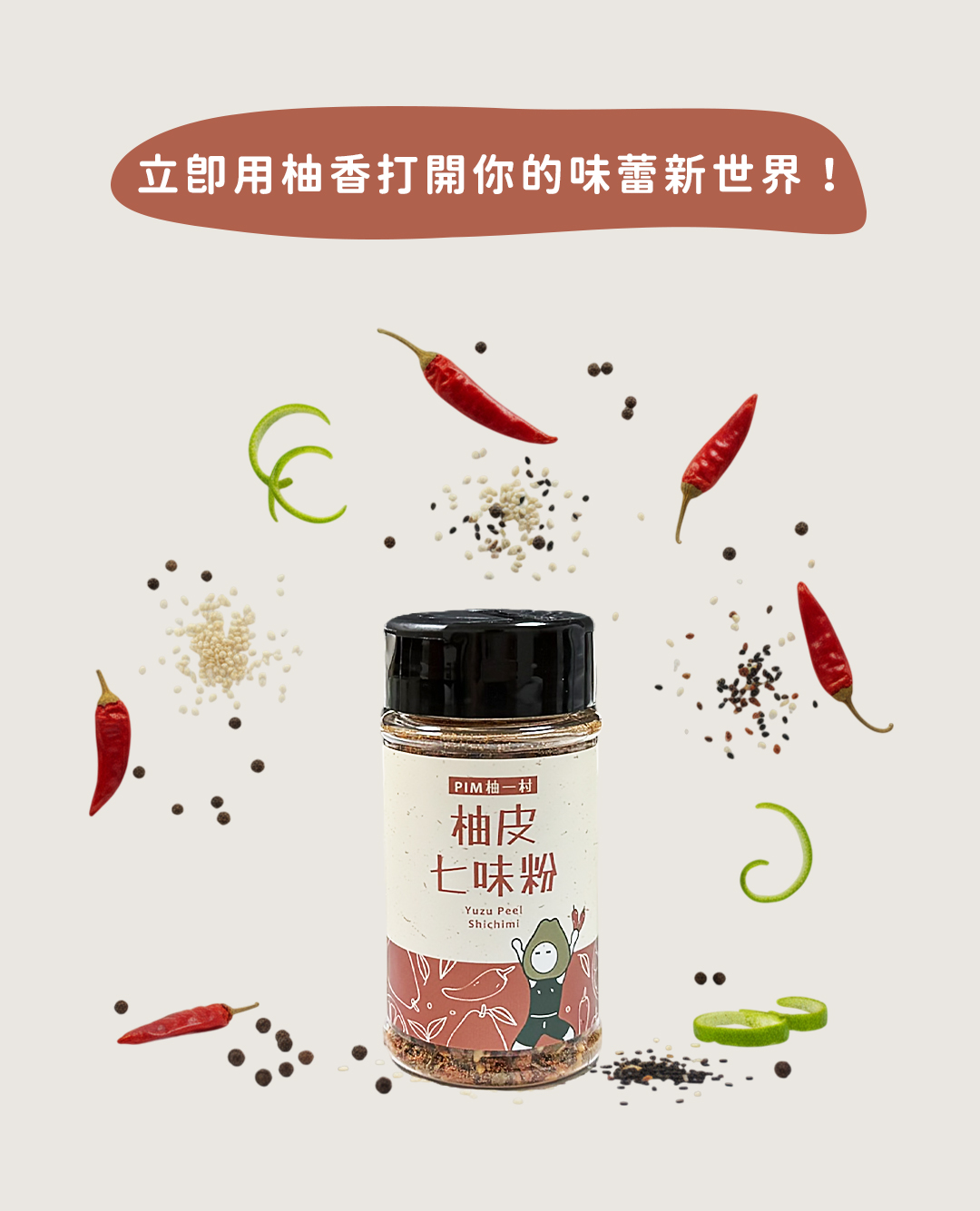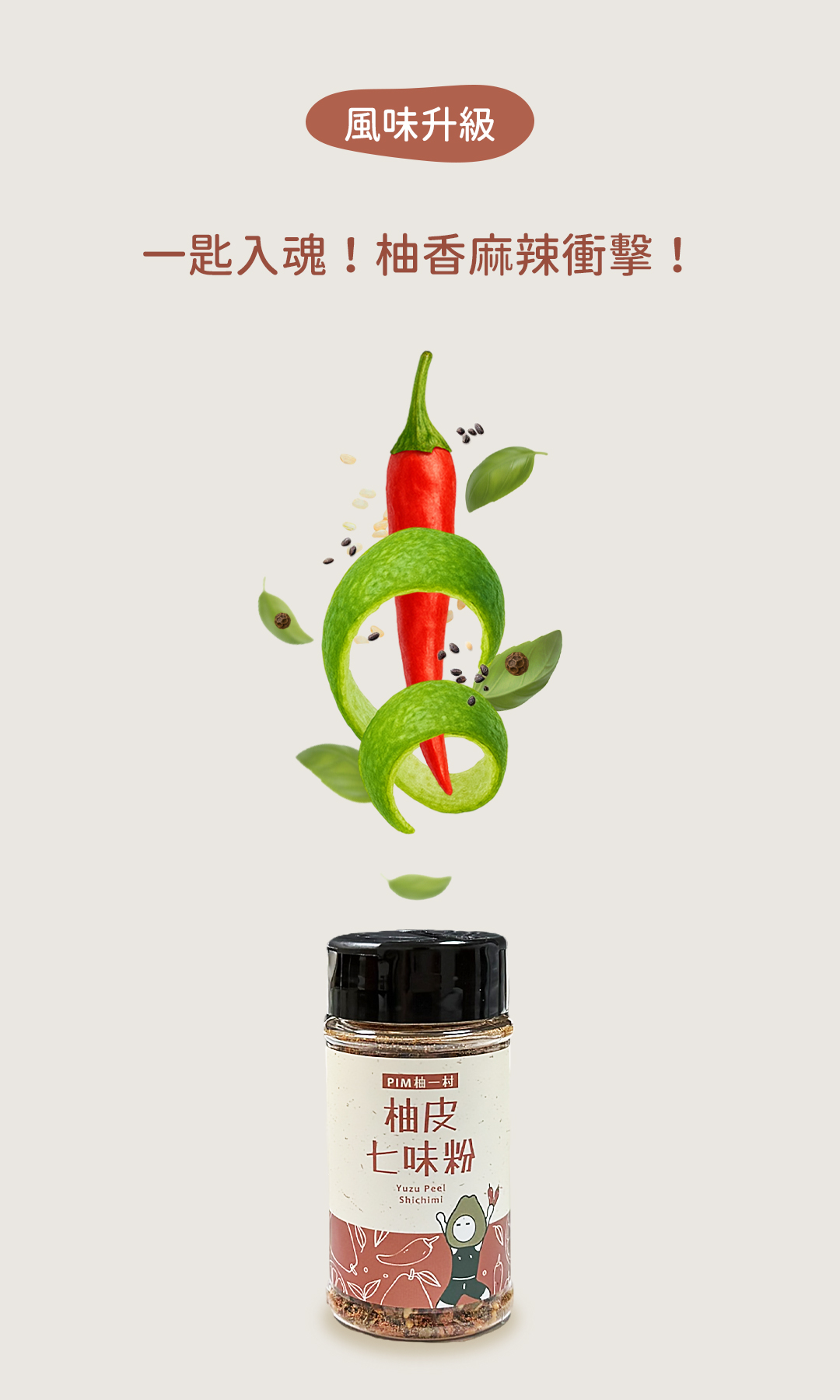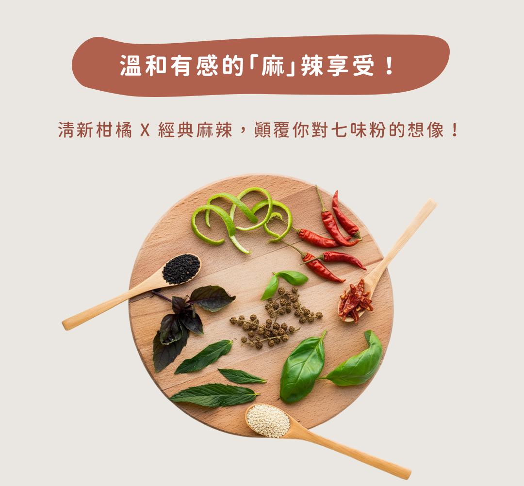 【成 分】: 辣椒、黑芝麻、白芝麻、羅勒葉、花椒、調味劑 (L-麩酸鈉)、食鹽、調味劑 (5'一次黃嘌呤核 苷磷酸二鈉、5'一鳥嘌呤核苷磷酸二鈉)、柚子、香料。